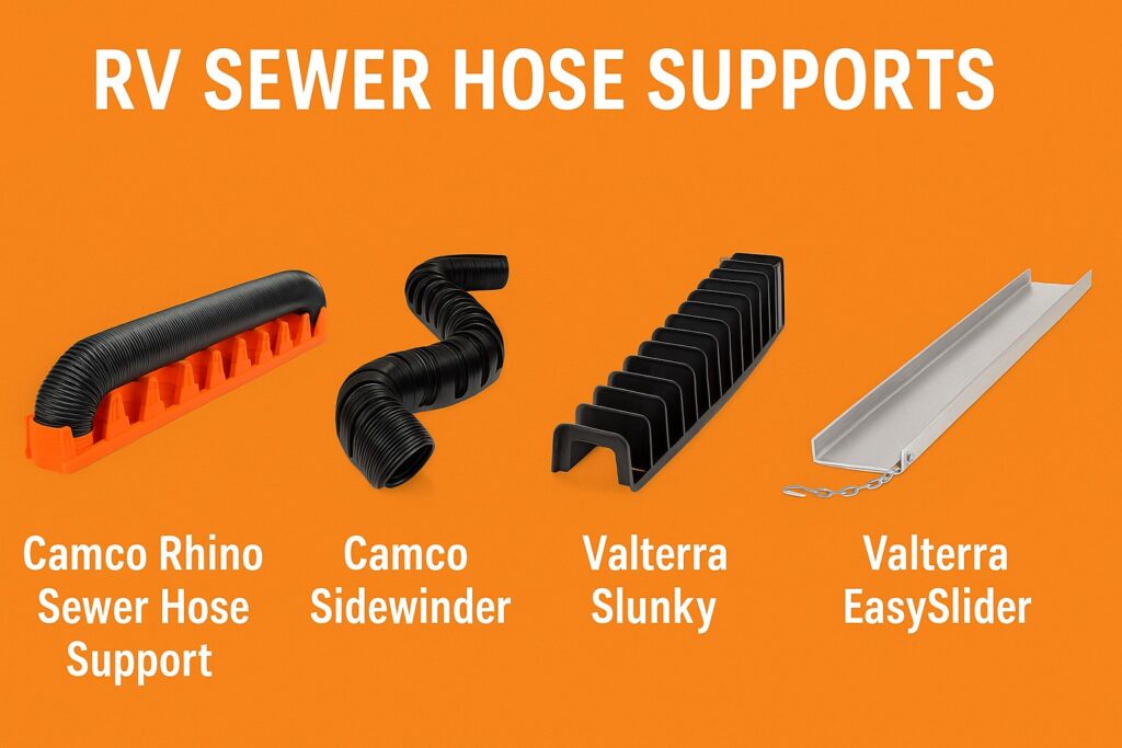 When it comes to RV sewer management, having the right hose support can make the difference between a smooth, sanitary dump and a frustrating, messy experience. Among the wide variety of products available, four models stand out as the most recognized and widely used in the U.S.: the Camco Rhino, Camco Sidewinder, Valterra Slunky, and Valterra EasySlider.