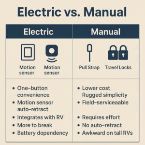 If you deploy frequently, have mobility concerns, or camp in gusty areas, electric plus motion sensor auto-retract is a quality-of-life upgrade. Budget/repair-focused owners often choose manual.